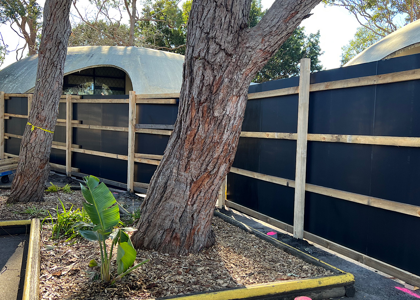 Site Hoardings used timber posts concreted into the ground and fixed rails and formply to achieve the required structural integrity.